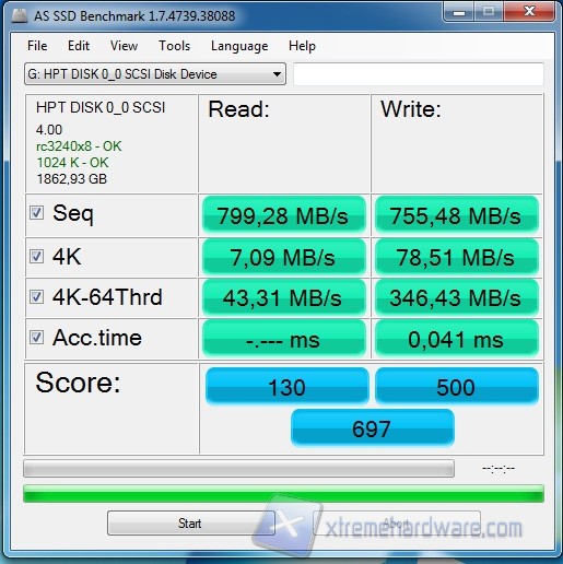 Andiamo quindi ad analizzare le prestazioni del controller prodotto di HighPoint collegando gli SSD e l'Hard Disk all'interfaccia proprietaria del controller. Per l'analisi delle prestazioni abbiamo usato diversi software di benchmark con lo scopo di misurare le effettive prestazioni ed abbiamo utilizzato le due modalità Maximum Performance e High Performance with Cache Protection. Le altre modalità dovrebbero garantire prestazioni rispettivamente simili ma aggiungere affidabilità grazie all'introduzione del RAID 1 di HDD.